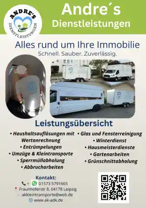 Willkommen bei Andres Dienstleistungen – Ihrem verlässlichen Partner für Haushaltsauflösungen, Umzüge und Sperrmüllabholungen in Leipzig! Seit unserer Gründung im November 2021 stehen wir für schnelle, professionelle und unkomplizierte Lösungen. Wir verstehen, dass Umzüge und Entrümpelungen oft mit Stress verbunden sind. Daher setzen wir alles daran, Ihnen eine reibungslose Erfahrung zu bieten.